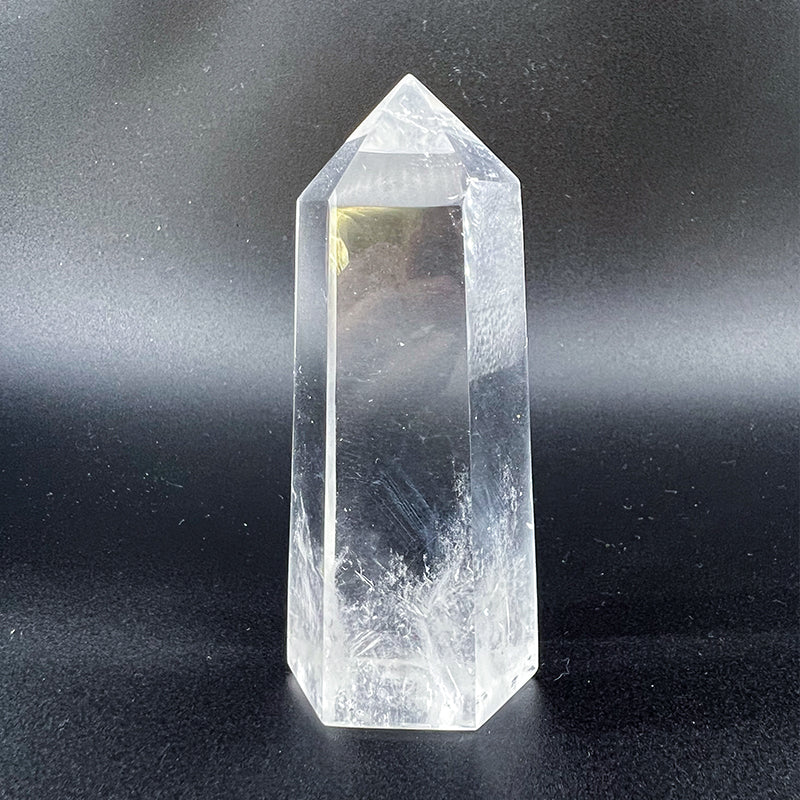 This is a natural clear quartz tower, featuring a transparent and luminous crystal with a pure texture. It stands upright in a hexagonal column shape with a naturally pointed tip, making it highly effective for energy direction. Known as the "King of Crystals," clear quartz is one of the most powerful and pure energy stones, offering comprehensive cleansing and amplification functions. It effectively clears negative energies from both individuals and spaces, balances the seven chakras, and raises overall vibrational frequency—making it an ideal choice for meditation, healing, and crystal grid work.
