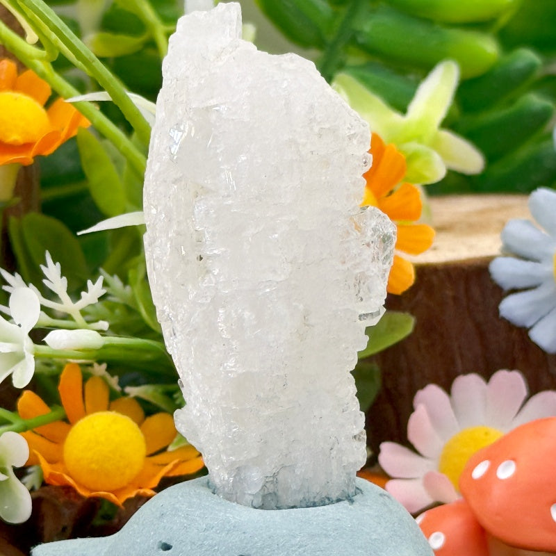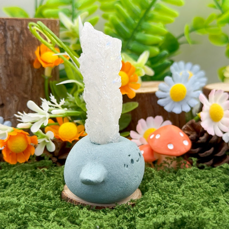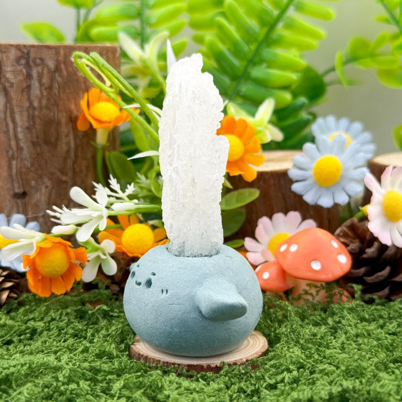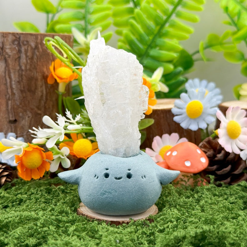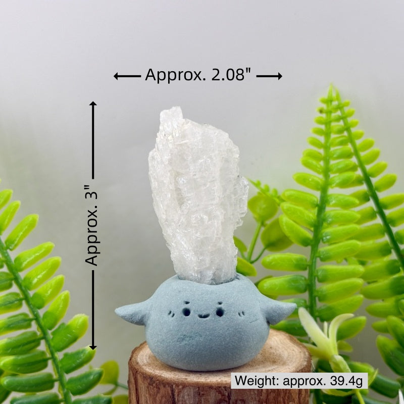This Faden Quartz Crystal Pet is handcrafted from natural clay, with a round and adorable shape paired with a charming smile, resembling a little guardian spirit by your side. At the top sits a piece of natural Faden Quartz, clear and radiant, with layered textures and its signature “thread-like” line inside, shining like ice carved by nature and radiating pure, mystical energy.