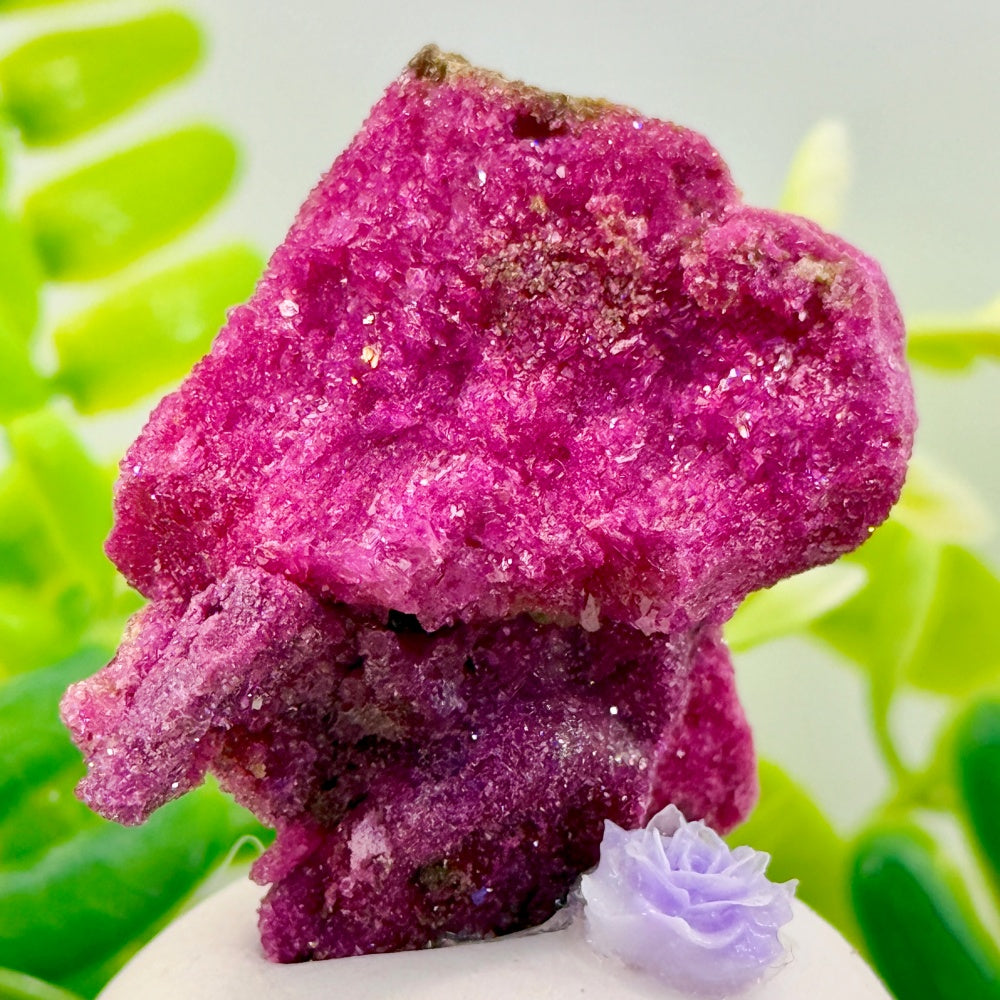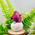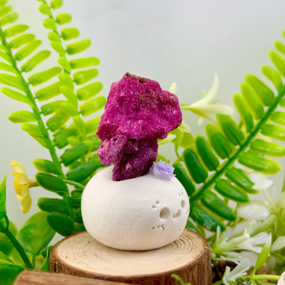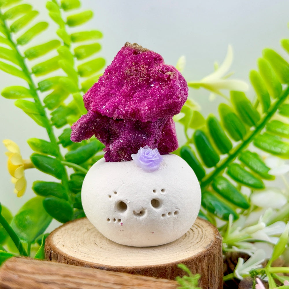 This adorable Ruby Crystal Pet is handcrafted from clay by the designer. Its simple and charming little bean shape is paired with a vivid cluster of natural ruby, blooming like a tiny flower of energy on its head.