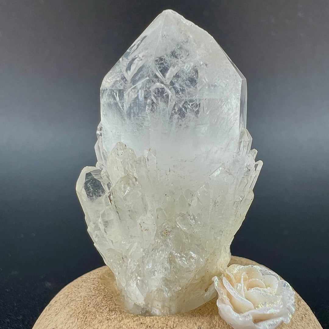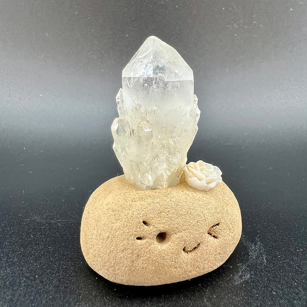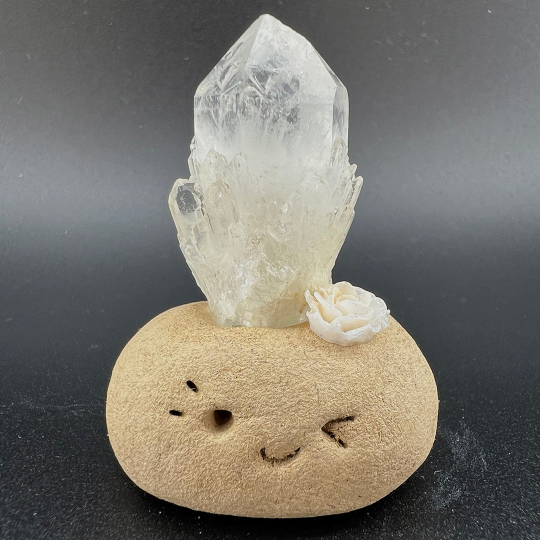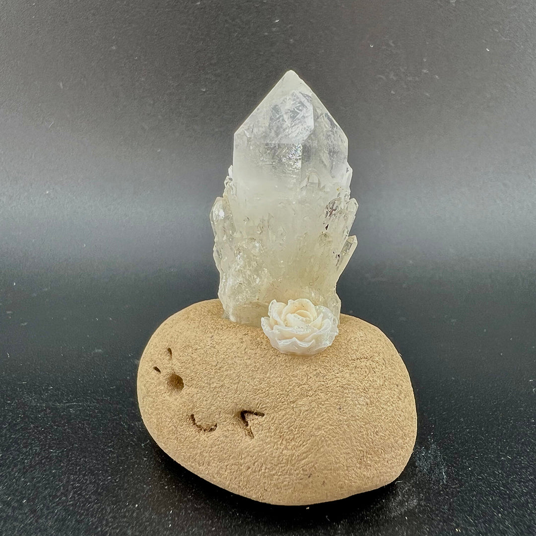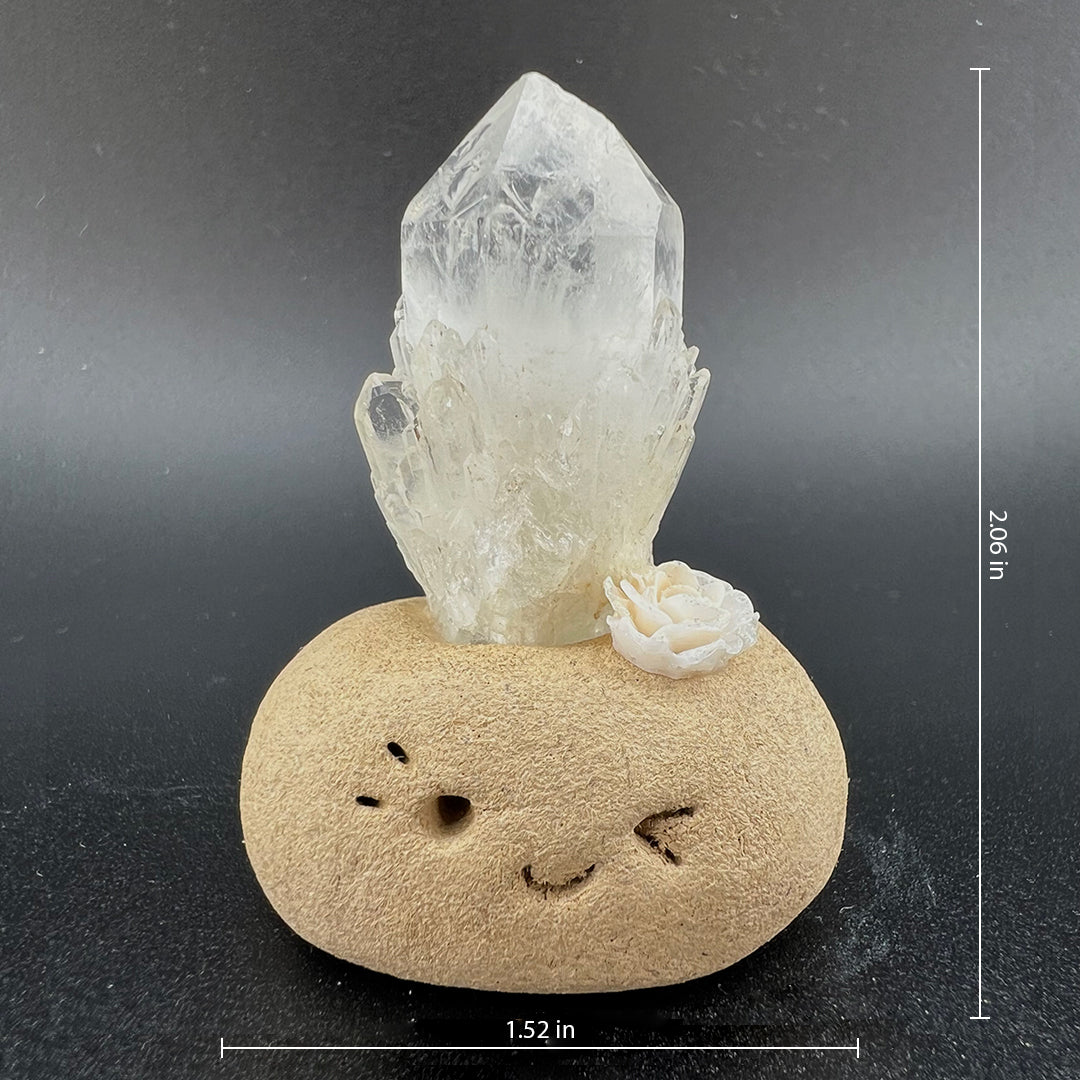 Atop its head rests a high-clarity cluster of raw white quartz, with crystals growing in an interwoven structure that resembles a sparkling miniature pineappleclear, luminous, and filled with pure, powerful energy. On one side, a handcrafted soft white rose glows faintly with a gentle shimmer, adding a touch of quiet romance and elegance to the overall piece.