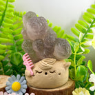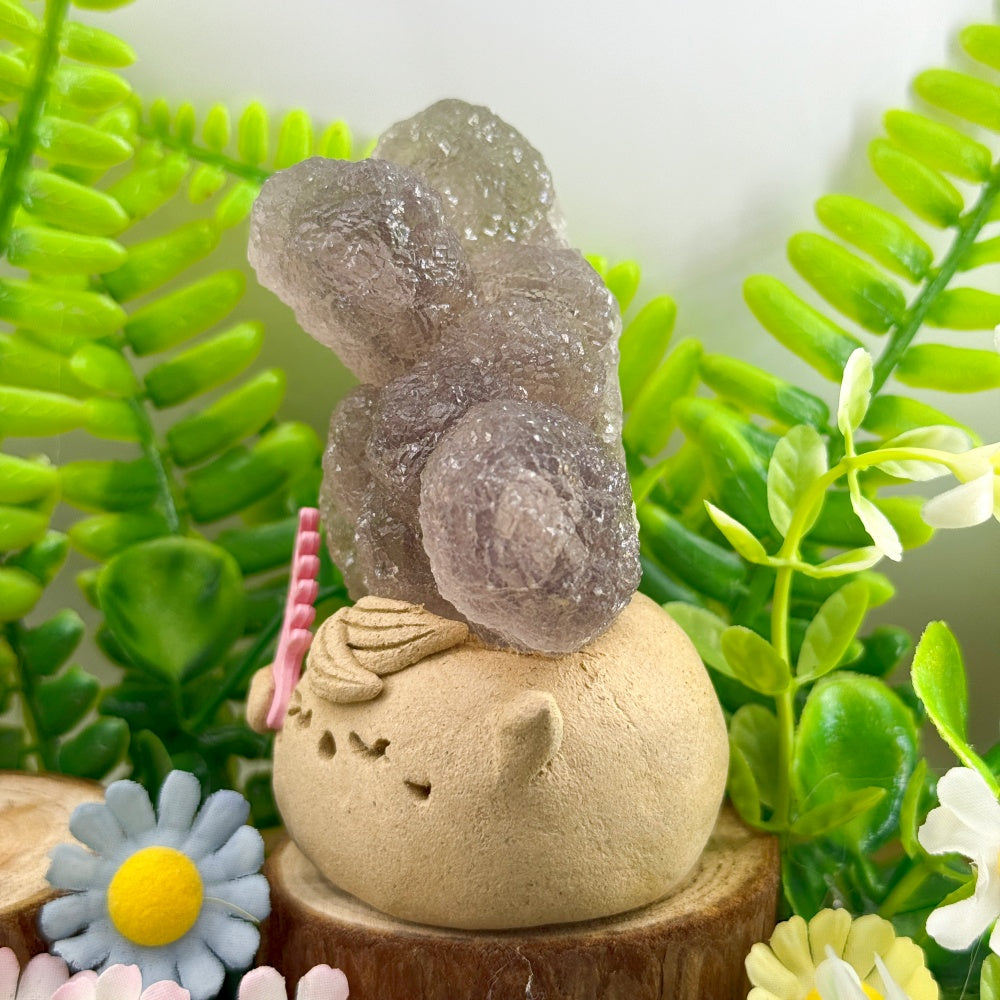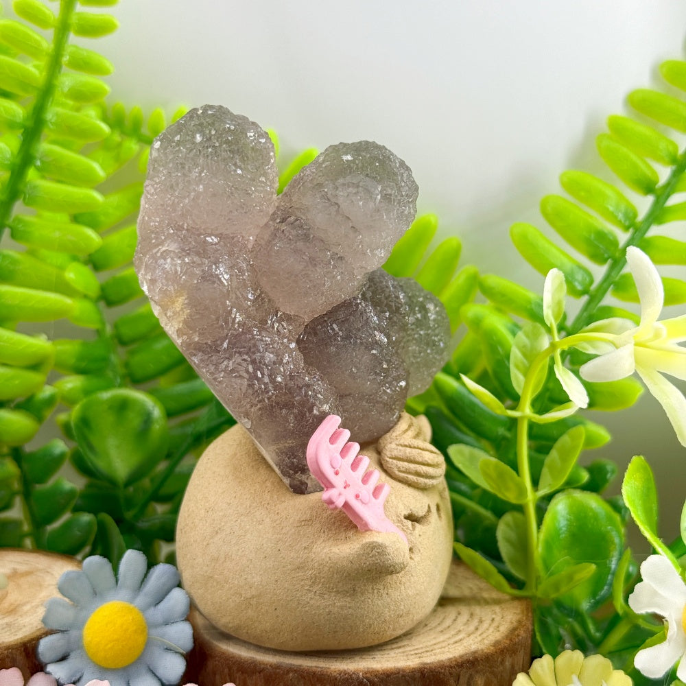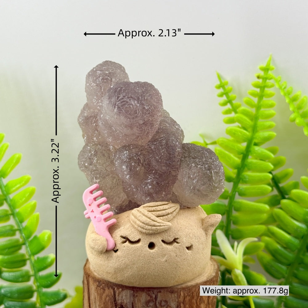 This Bubble Fluorite Crystal Pet is delicately handcrafted from clay by the designer, featuring a rounded and gentle form that radiates calmness and a touch of dreamlike serenity. With its eyes closed and a pink comb in hand, the little figure seems to be quietly combing through its thoughts, enjoying a peaceful moment of stillness. On its head sits a cluster of natural bubble-shaped fluorite crystals, layered and glowing with soft grayish-purple hues—light and airy like floating bubbles—offering both visual and energetic healing.