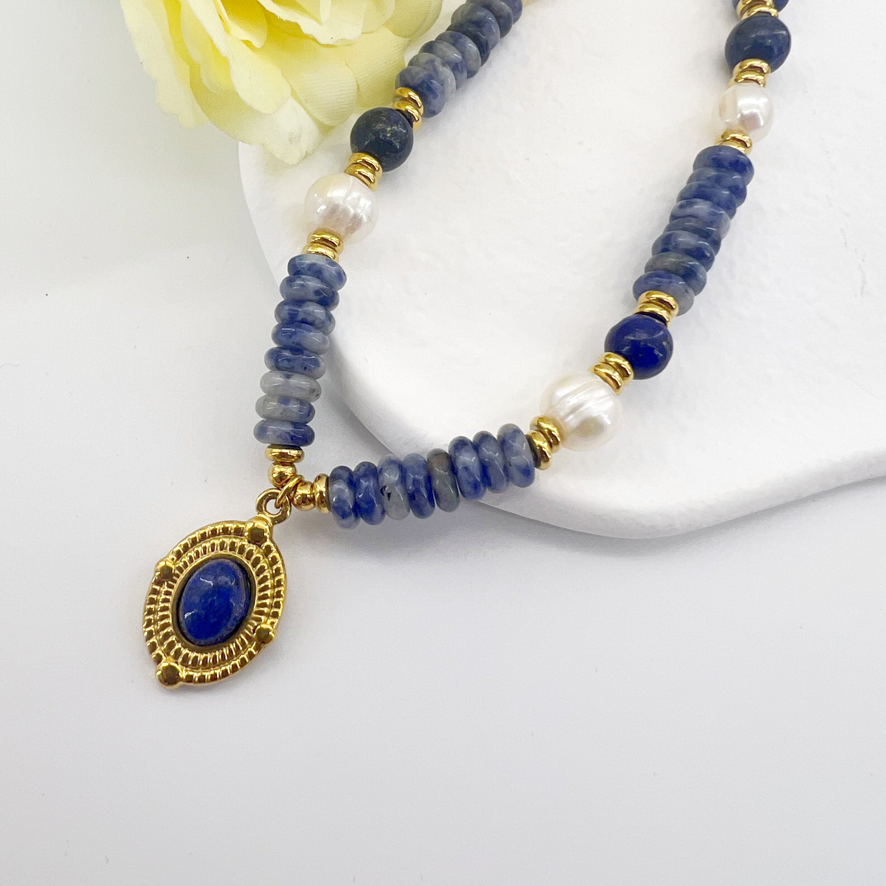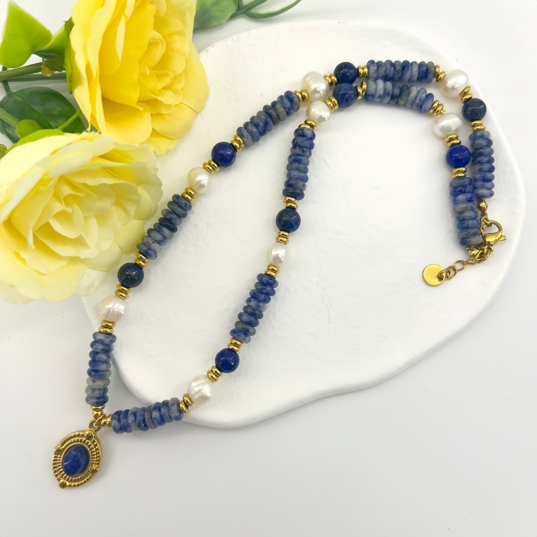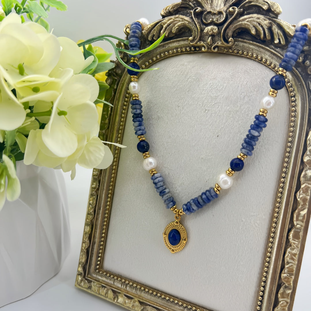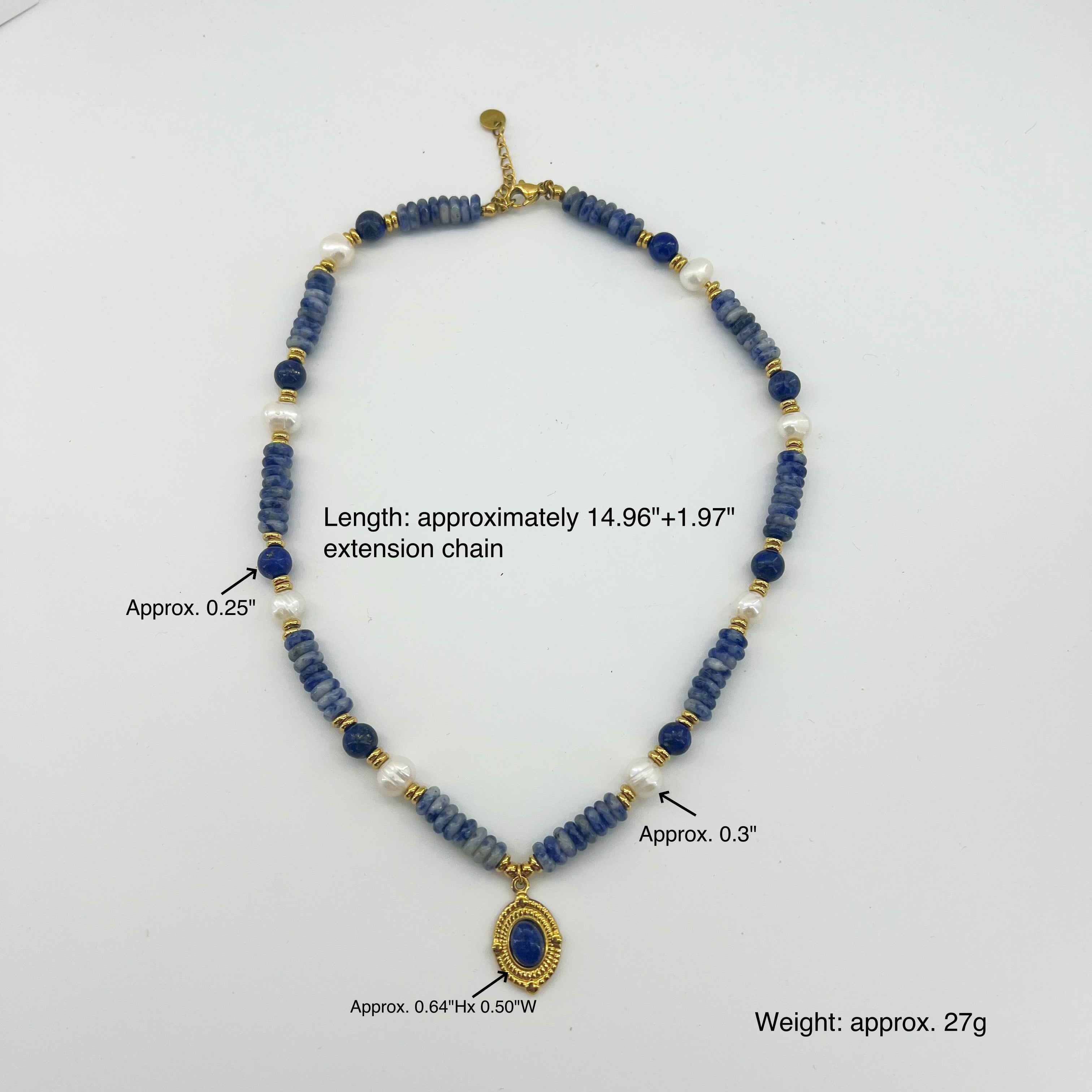 This freshwater pearl and lapis lazuli vintage pendant necklace draws inspiration from timeless retro aesthetics, blending the spiritual energy of natural stones with modern understated luxury. It’s a refined accessory that combines symbolic protection with sophisticated style. The main strand features hand-strung deep, elegant lapis lazuli and lustrous freshwater pearls, creating a rich texture and luminous finish. Its classic, subdued color palette makes it versatile for various outfits.