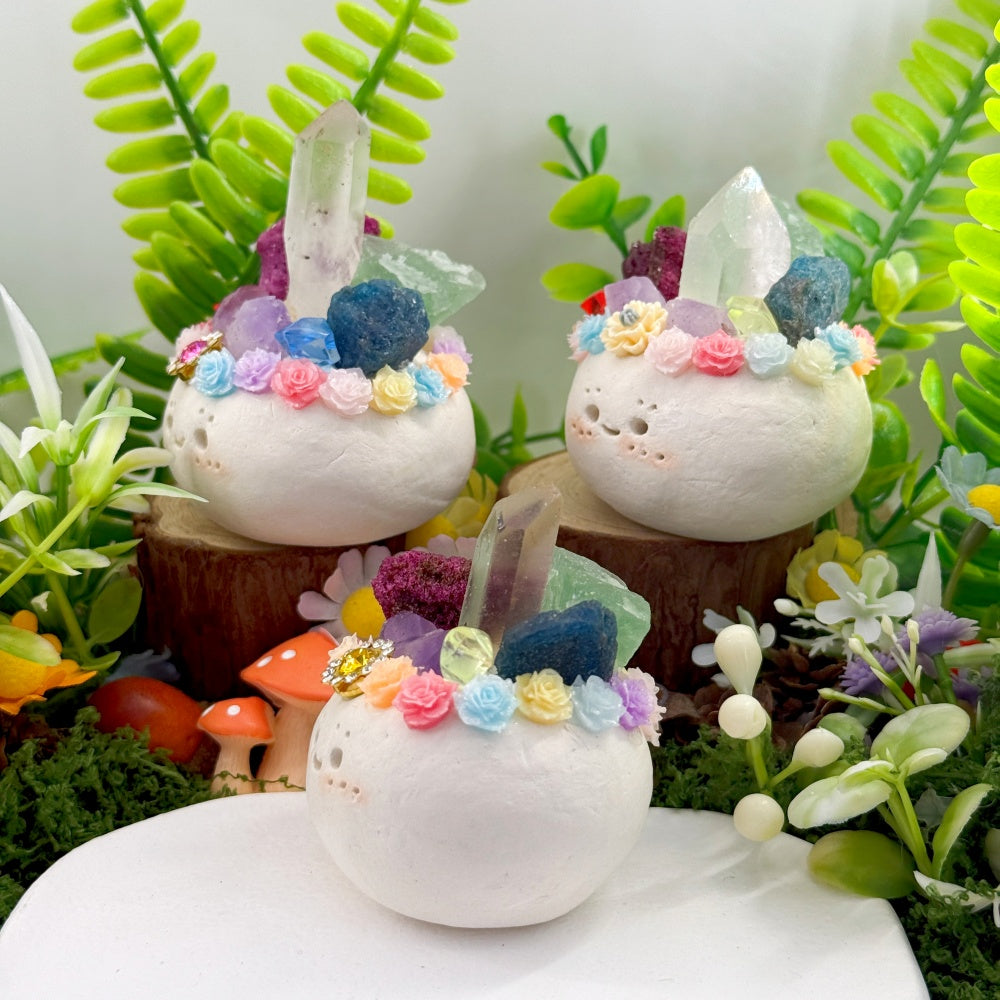 6. For daily cleaning, use a soft brush to gently remove dust, or wipe the crystal stone with a dry or slightly damp cloth. Be careful not to get the clay base or surface wet.