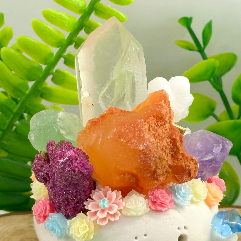 3. You may gently apply a small amount of essential oil to the crystal, but please avoid getting any oil on the clay surface or base. Do not soak or completely cover the crystal in oil.