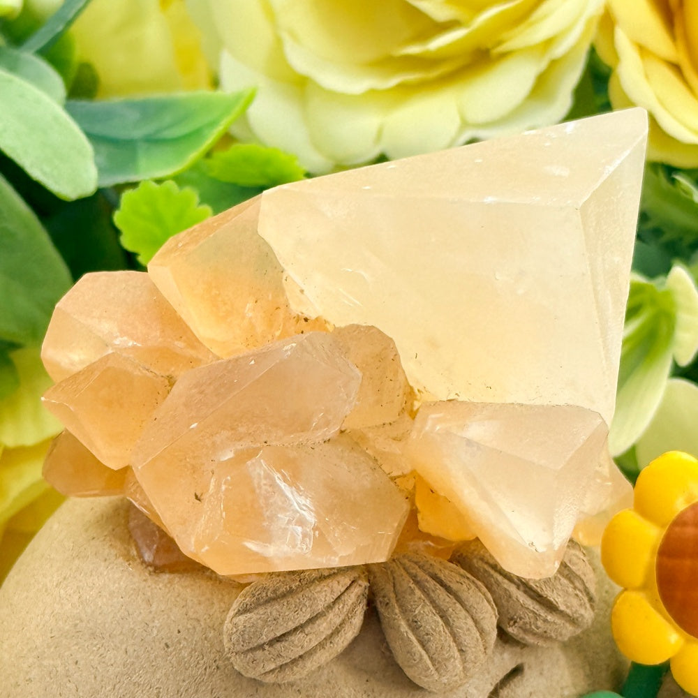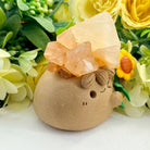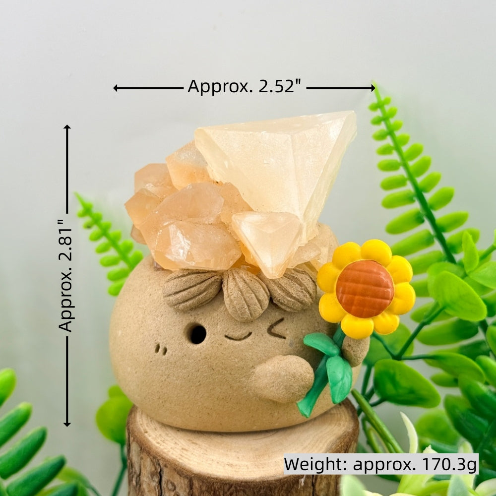 This Red Calcite Crystal Pet features a natural red calcite stone placed on top, paired with a hand-shaped rounded form and sunflower elements. The overall design feels warm, bright, and full of vitality.