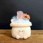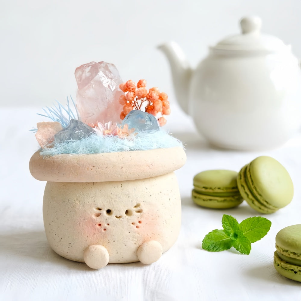 Hand-sculpted from clay, this little planter Crystal Pet features a round, adorable body with tiny feet, a gentle smile, and softly blushed cheeks. Topped with rose quartz, calcite crystals, and delicate floral accents, it resembles a miniature dreamlike garden quietly resting atop the planter.