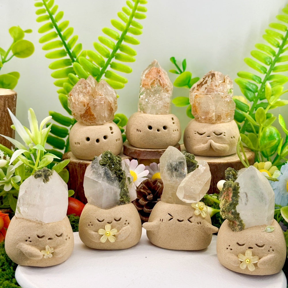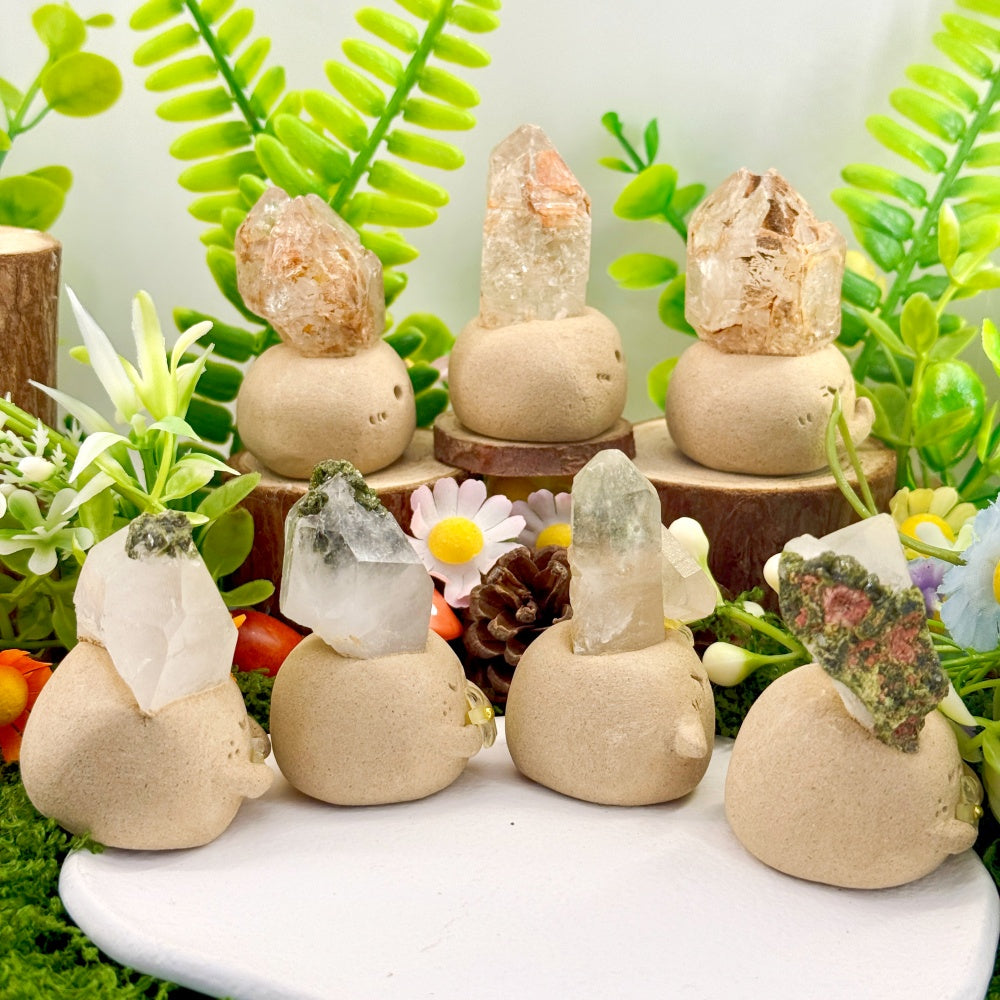 6. For daily cleaning, use a soft brush to gently remove dust, or wipe the crystal stone with a dry or slightly damp cloth. Be careful not to get the clay base or surface wet.