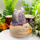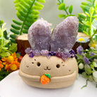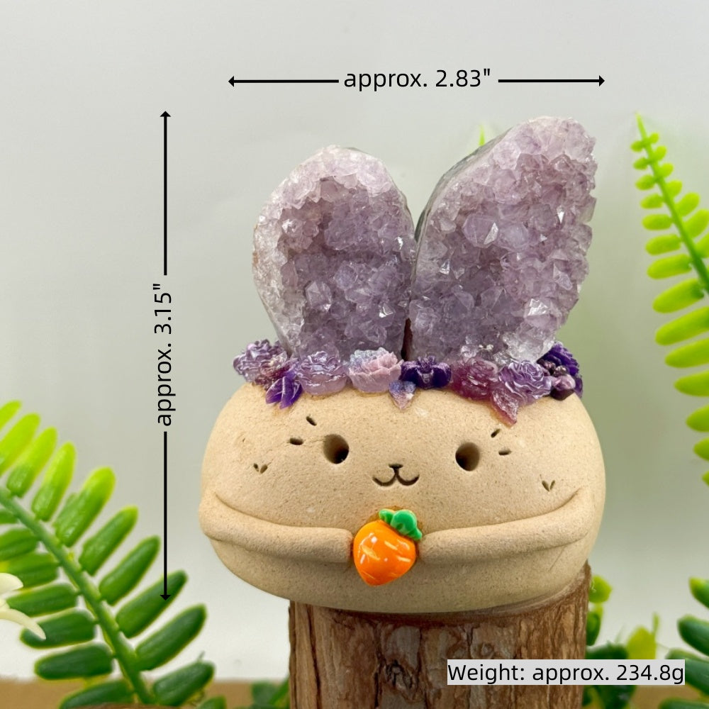 Its rounded little body is paired with natural heart-shaped amethyst geode bunny ears, making it both adorable and uniquely comforting at first glance.