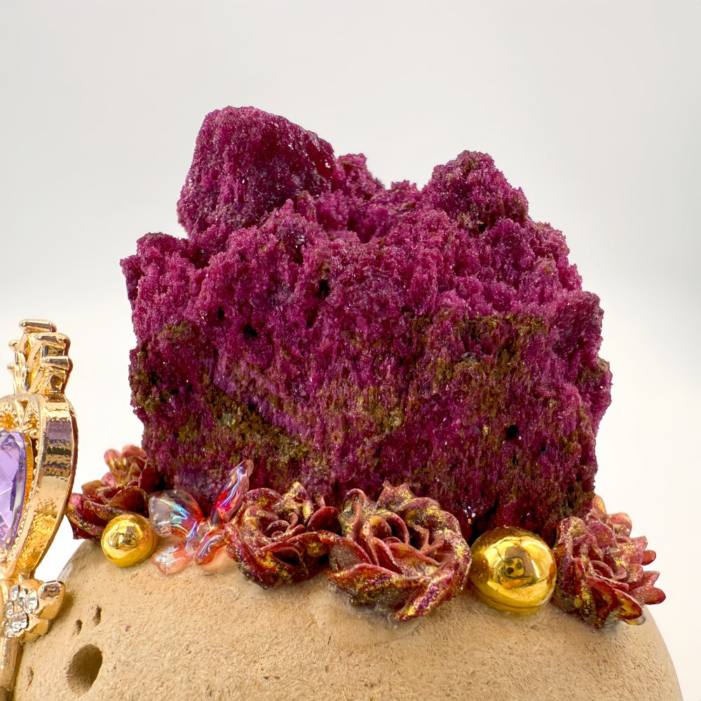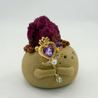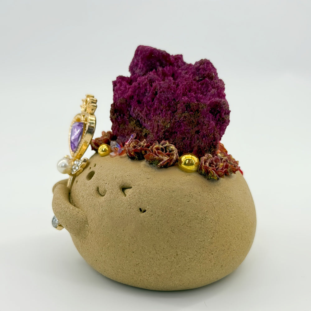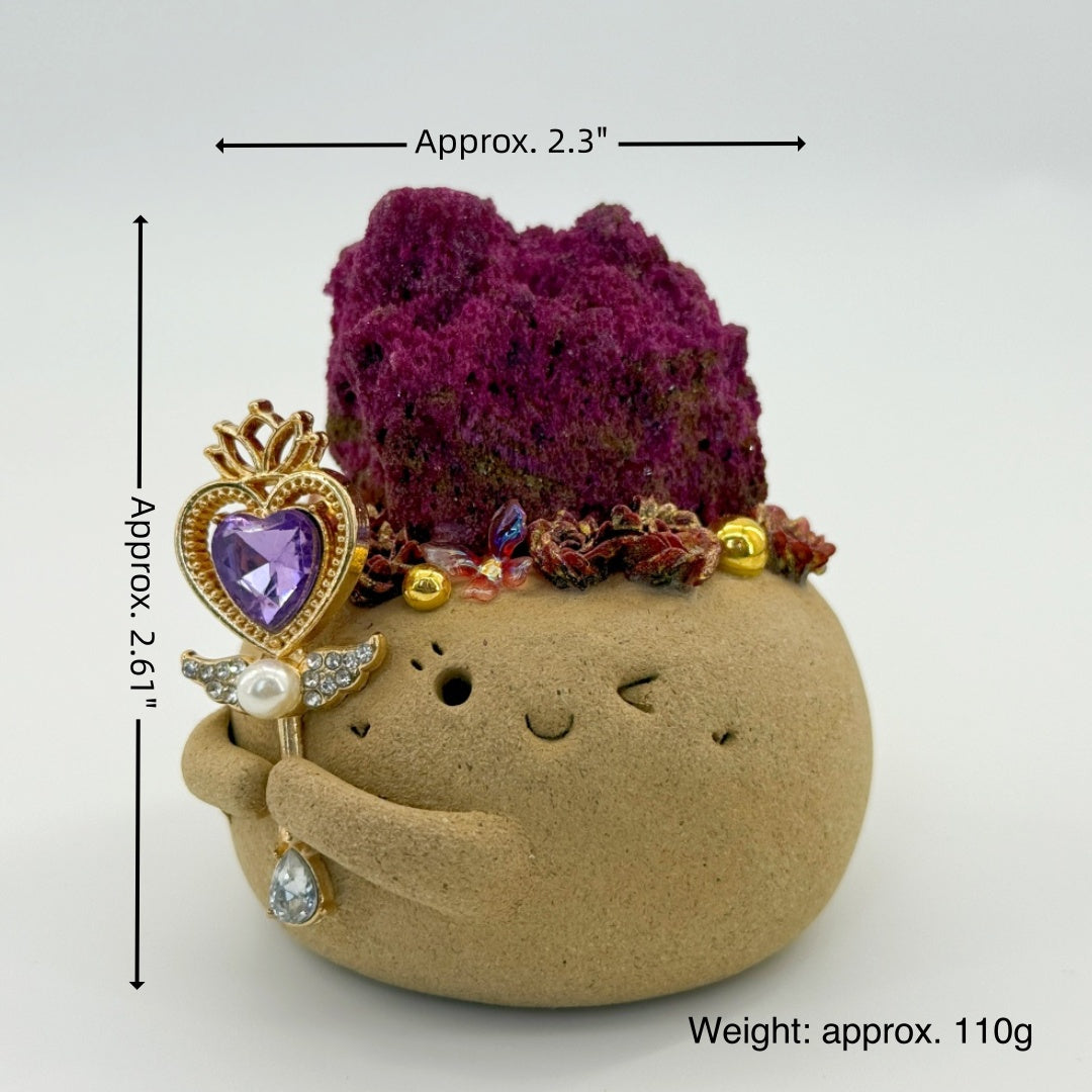 This playful and charming handcrafted Crystal Pet is made from natural clay, with a mischievous smile on its face and a delicate scepter in hand, adorned with a purple heart-shaped gemstone and faux pearl accents. On top rests a natural Red Corundum (Ruby) raw stone, rich in texture and brilliance, radiating passionate and steady energy. Known as the “Stone of Love and Courage,” Red Corundum (Ruby) inspires vitality, boosts confidence and motivation, dispels negative energy, and awakens enthusiasm for both life and love. At the same time, it stabilizes emotions, bringing warmth and a sense of security, serving as a natural source of strength for emotional balance. Whether placed in the bedroom, on a desk, or gifted to someone dear, it adds a touch of warmth and vitality to any space, allowing you to feel the passion and empowering energy of Red Corundum (Ruby) in daily life.