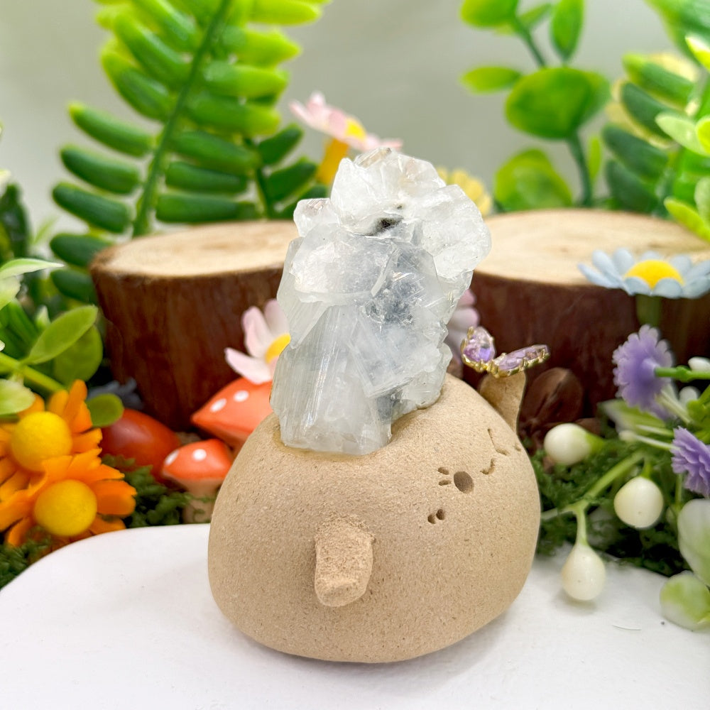 6. For daily cleaning, use a soft brush to gently remove dust, or wipe the crystal stone with a dry or slightly damp cloth. Be careful not to get the clay base or surface wet.