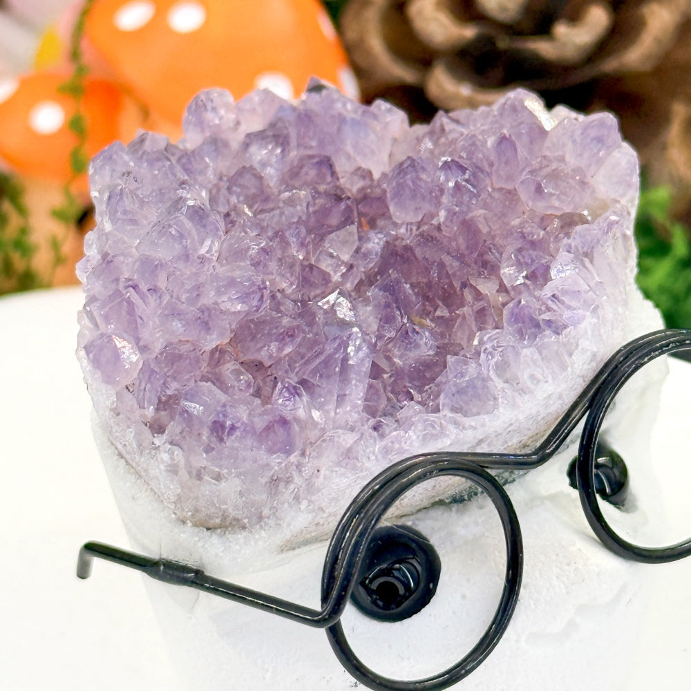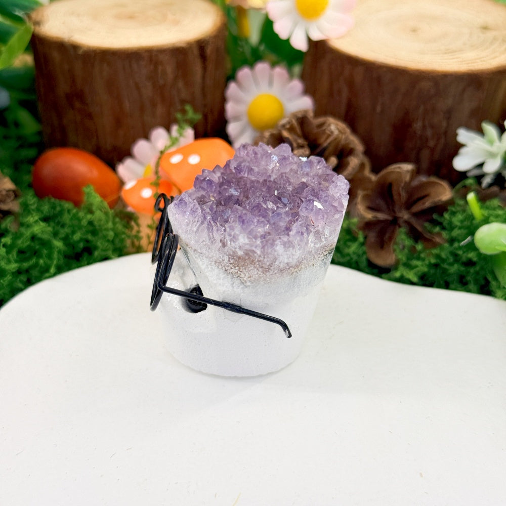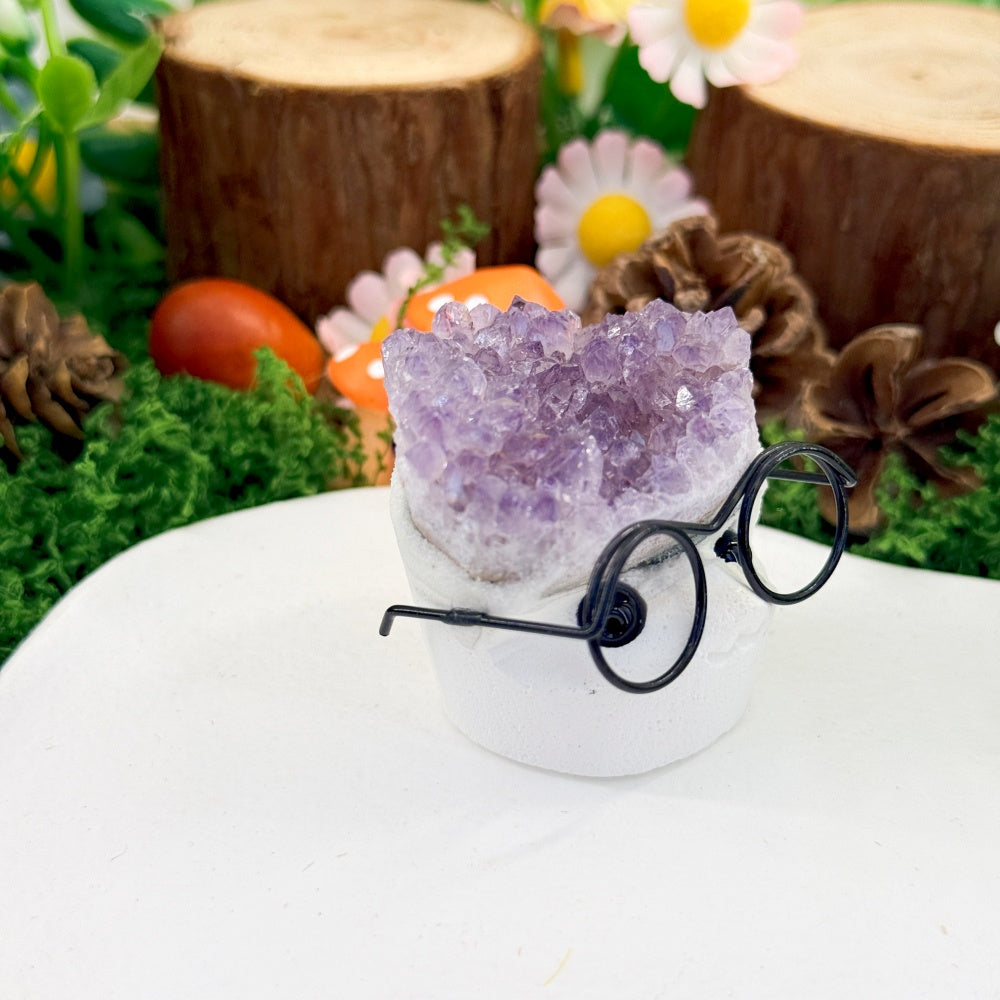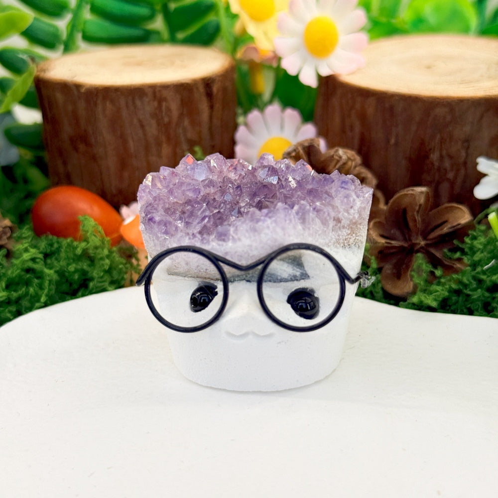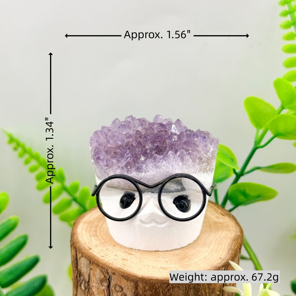 This Amethyst Glasses Crystal Pet is full of childlike charm and playfulness. Hand-carved from quartz sand, it features a round-faced child wearing a pair of whimsical glasses, with an adorable expression that brings instant joy and comfort. Crowned with a cluster of natural amethyst crystals that shimmer brightly, it resembles a halo of wisdom, radiating serenity and protection into daily life.