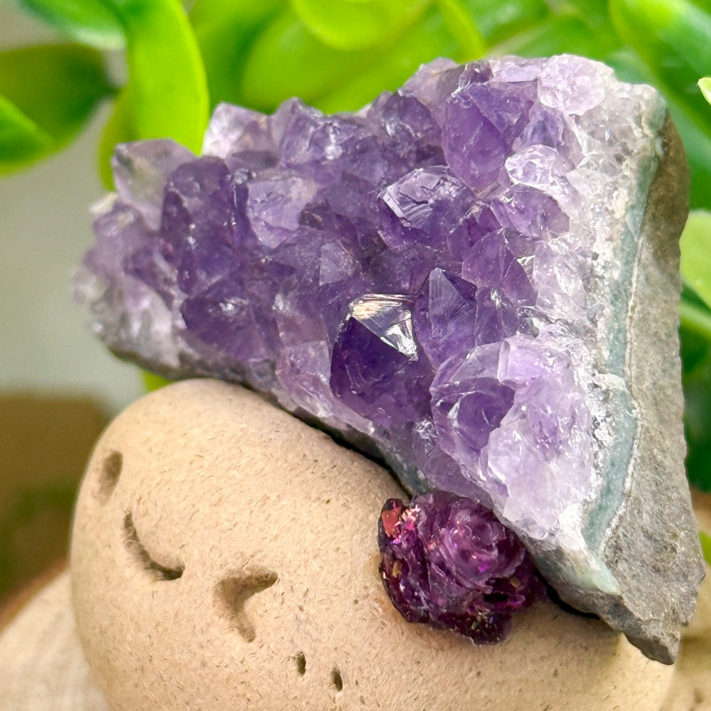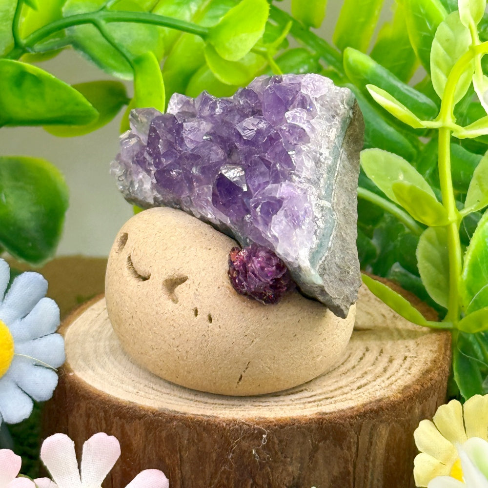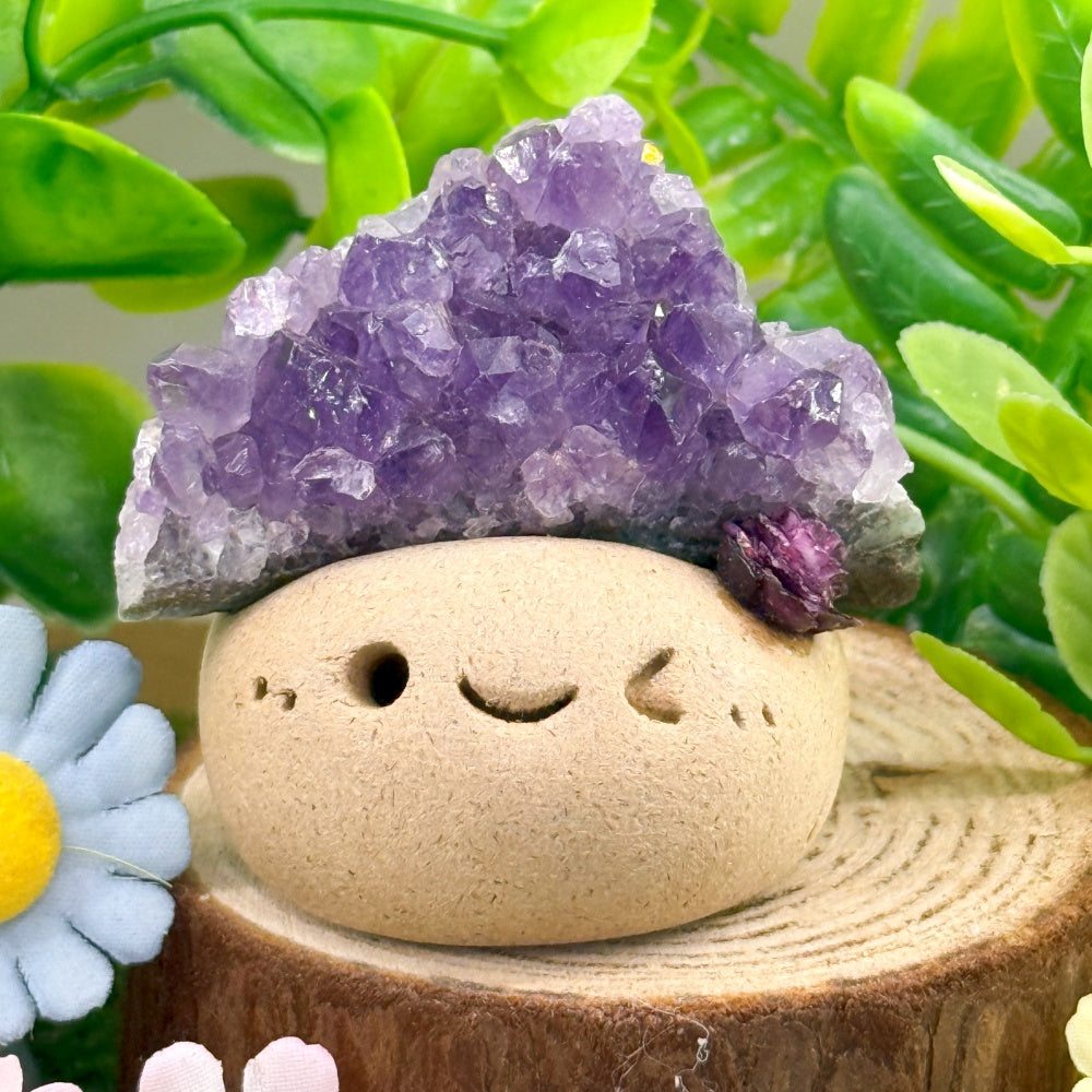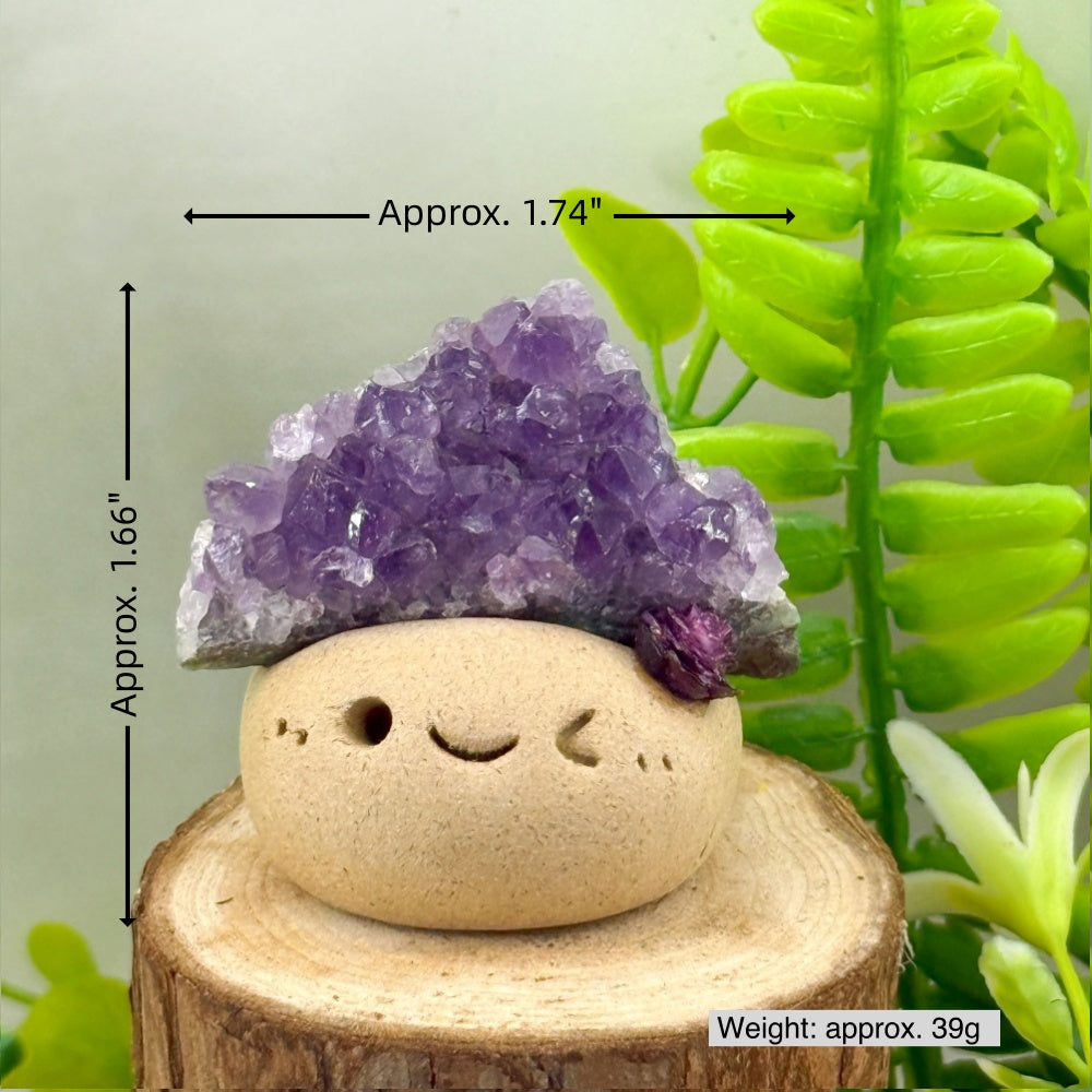 This Amethyst Crystal Pet is delicately handcrafted from clay by the designer, topped with a natural cluster of amethyst crystals. The deep purple crystals sparkle like mysterious stars in the night sky. With its playful smile and lively charm, this little guardian brings warmth and healing energy into everyday life.