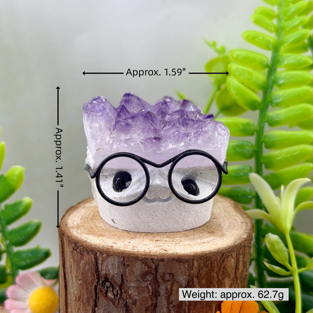 This “Amethyst Glasses Kid Crystal Pet” is small and adorable, with a round little face topped by a pair of cute round glasses, blending innocence with a hint of cleverness. On its head blooms a cluster of natural amethyst crystals, transparent and sparkling like a crown of spirituality, adding a dreamy and wise aura to its charm.
