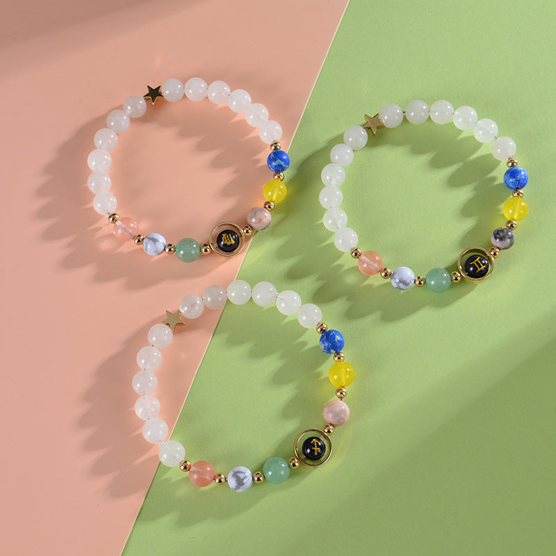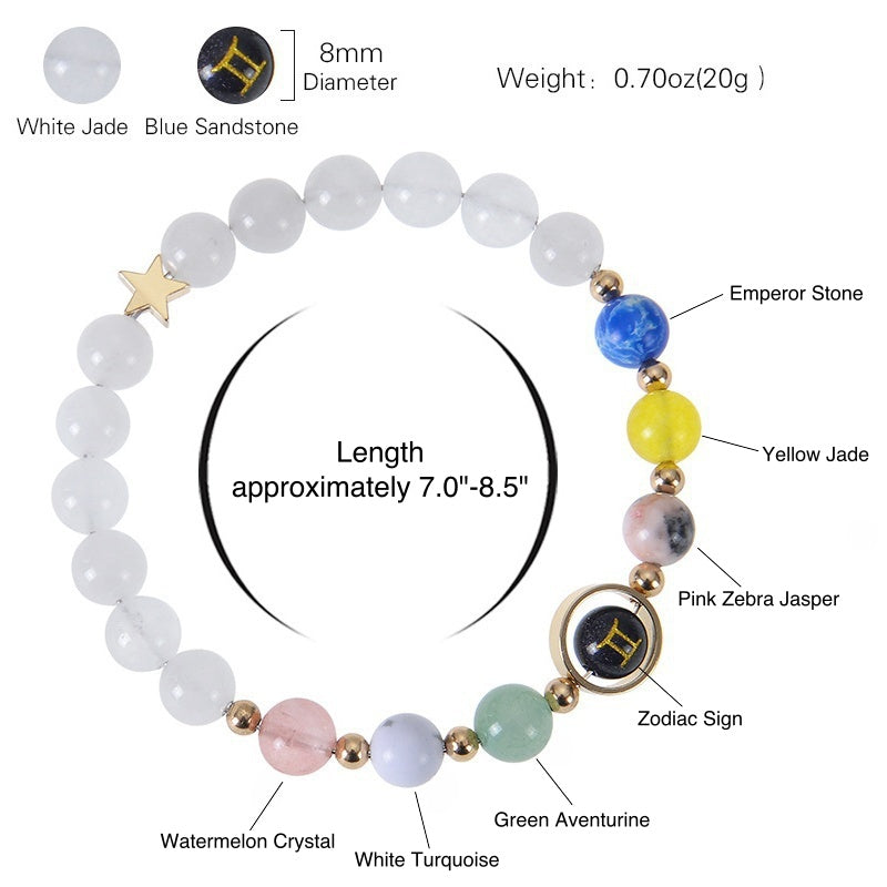 The blue sandstone beads symbolize cosmic energy, bringing calm and strength. The zodiac engraving design allows each bracelet to reflect the personal traits of the zodiac sign. The natural crystal beads convey various energies and blessings, promoting physical and spiritual balance. The gold accessories enhance the quality and beauty.