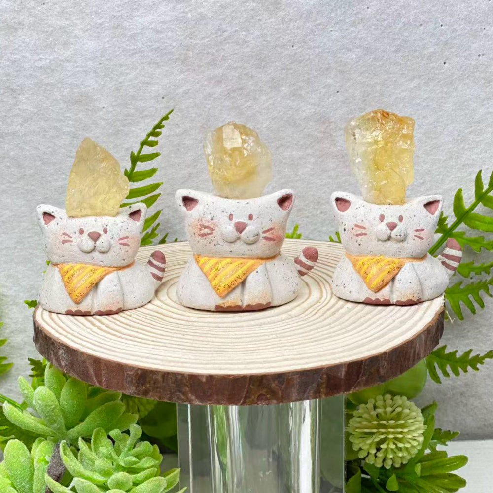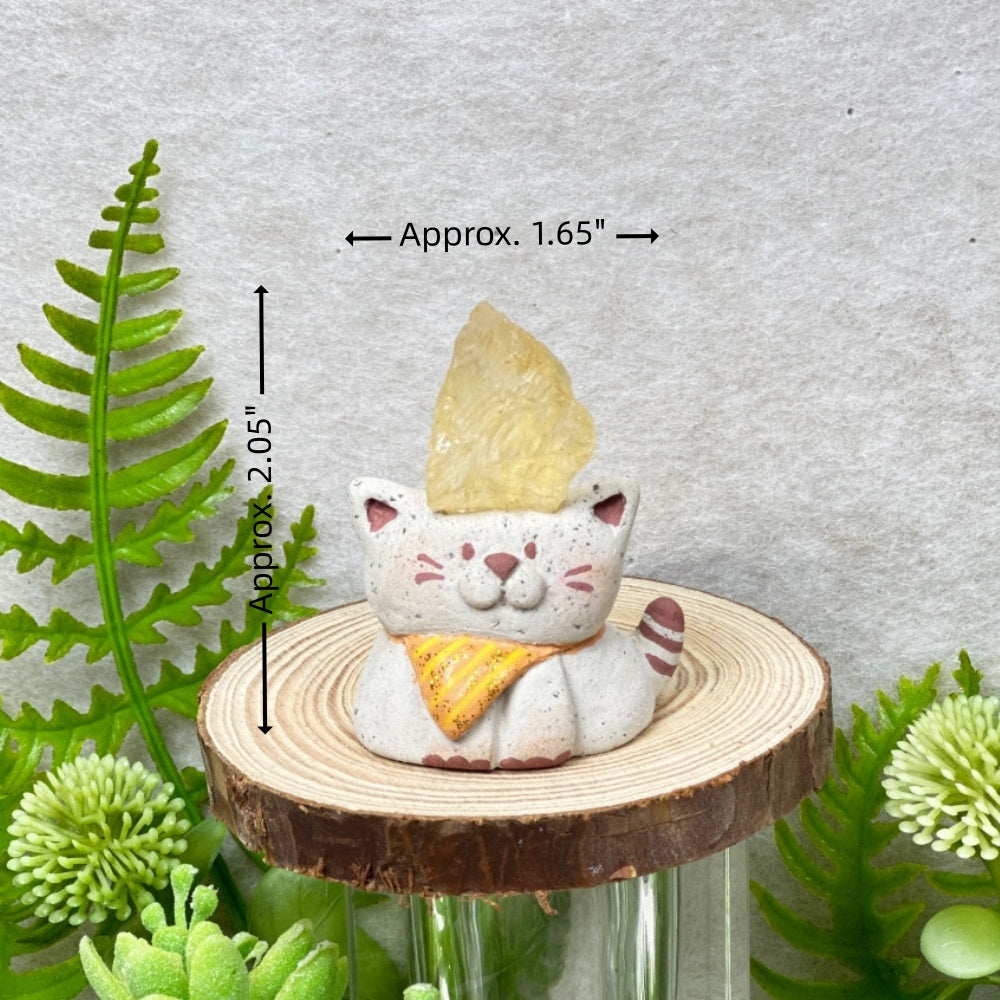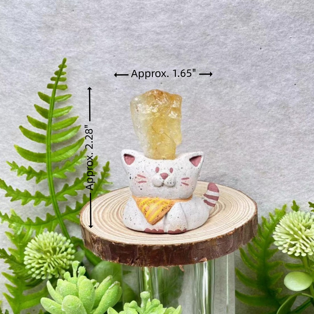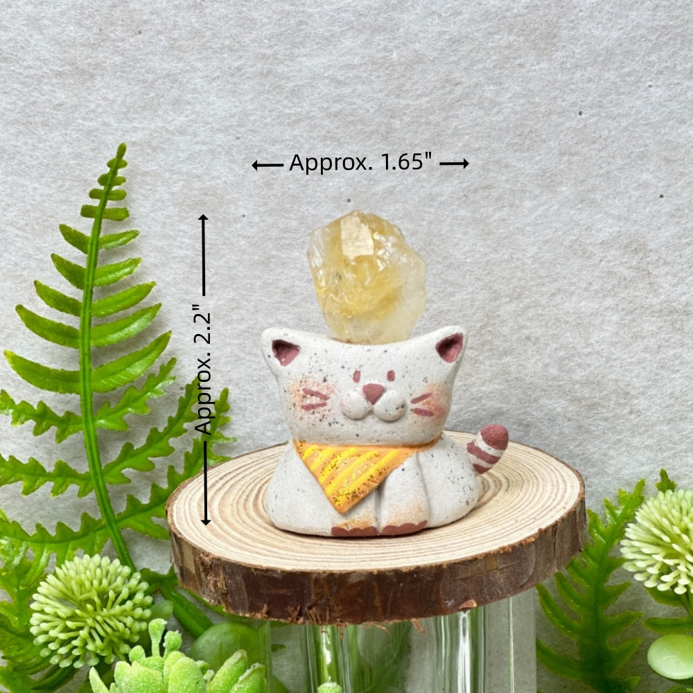 This Citrine Cat Crystal Pet is delicately handcrafted from clay by the designer, with every detail infused with warmth and creativity. The playful cat figure wears a cheerful yellow scarf, topped with a natural citrine crystal that glows with bright golden light, as if capturing the radiance of the sun and its vibrant energy.