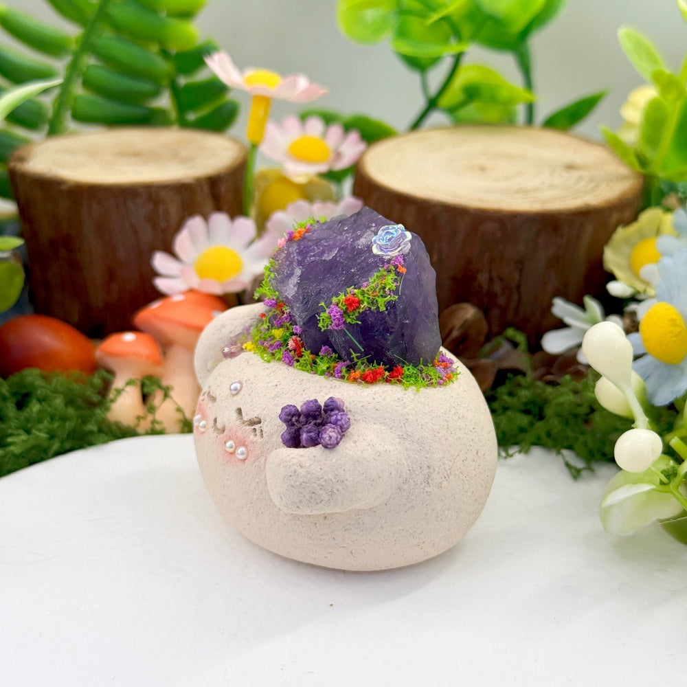 Its rounded body and closed-eye smile carry a sense of unhurried ease. Resting atop its head is a natural raw amethyst crystal, as if gently holding the softness of night and a quiet state of mind close by.