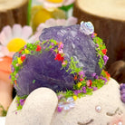 The amethyst displays natural layers of purple tones and crystalline structure, appearing clear and dreamlike under the light. Delicate floral details and subtle accents add a fairytale-like softness to the overall design. Each amethyst is unique—no two crystals share the same shape or pattern.