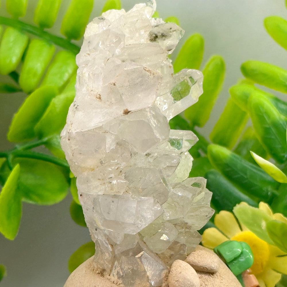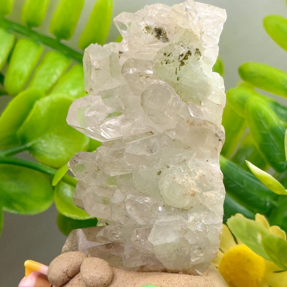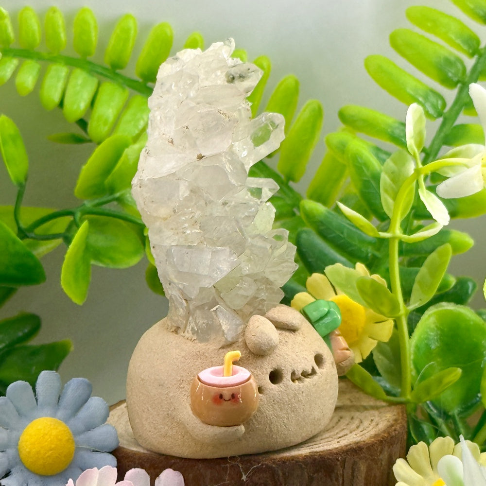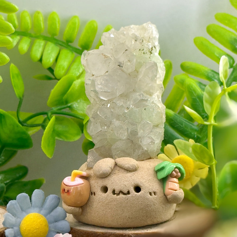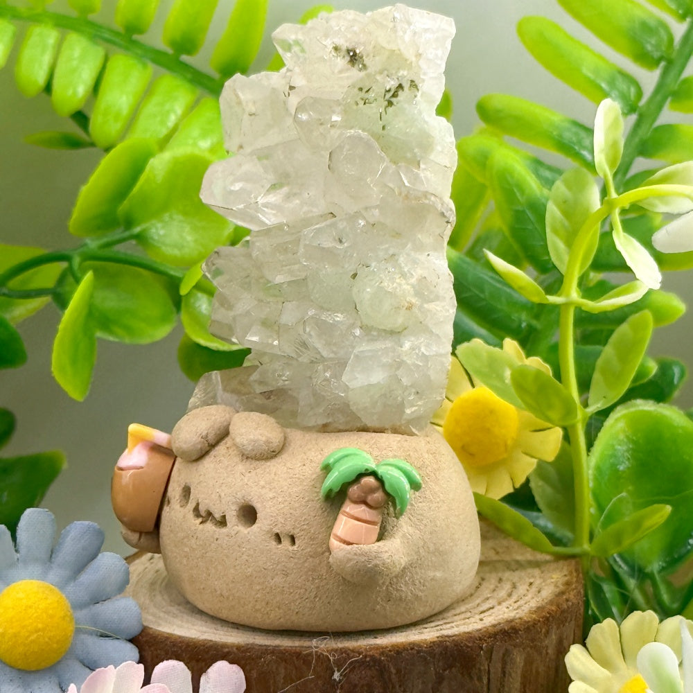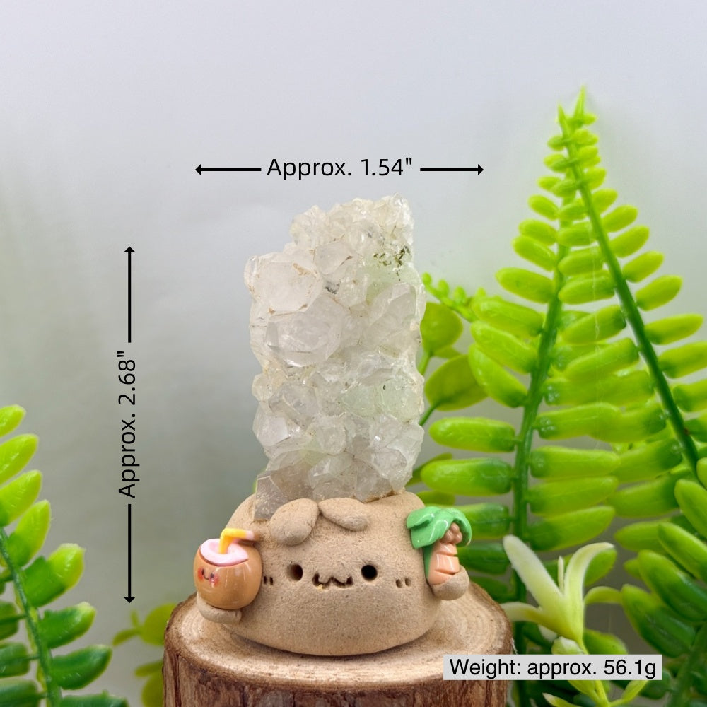 This handmade Crystal Pet is sculpted from clay and crowned with a cluster of natural prehnite crystals. The soft, pale-green sheen glimmers like morning dew, radiating a calm and refreshing energy. Paired with a tiny coconut drink and palm-tree accents, the design adds an easygoing, relaxed vibe—like a tropical guardian of good energy.