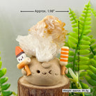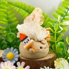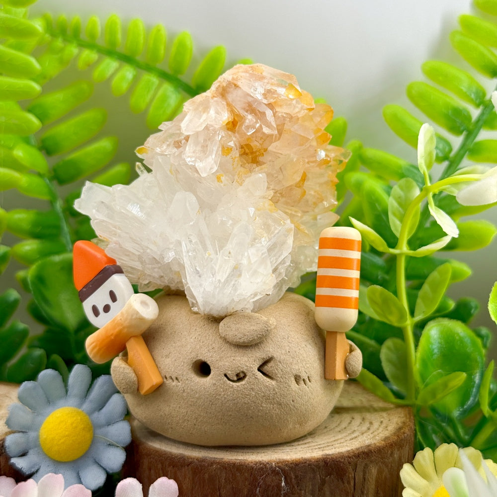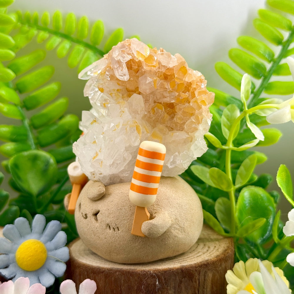 This Yellow Crystal Cluster Crystal Pet is delicately handcrafted from clay by the designer, featuring a warm, rounded shape that radiates sunshine-like positivity and joy. The little bean-shaped figure holds a Japanese chikuwa and a crab stick in its hands, wearing a content and adorable expression—as if savoring the simple, happy moments of everyday life. On its head rests a natural yellow crystal cluster, with layers of golden and clear crystals glistening like morning light cascading over a mountain peak, glowing with vibrant life energy.
