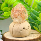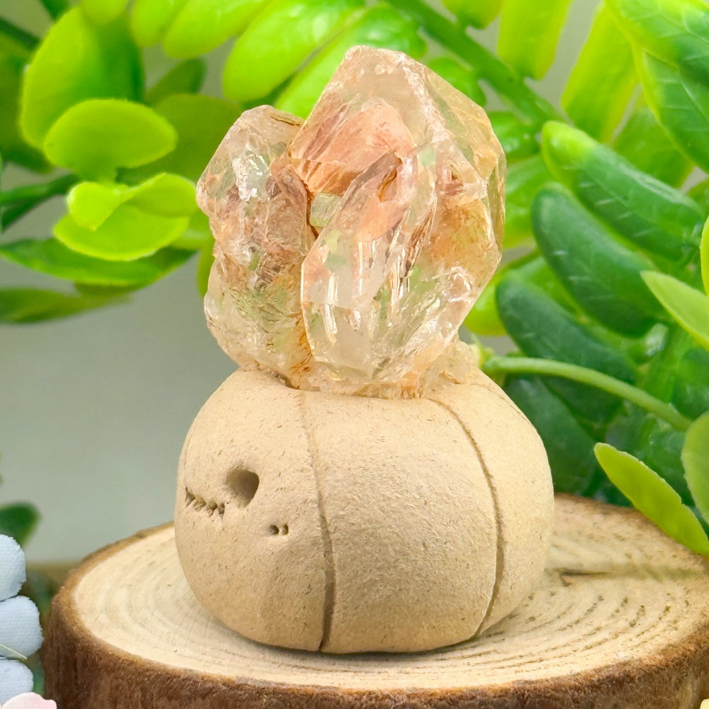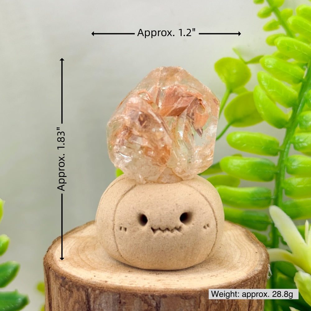 Atop its head sits a natural Red Skeleton Quartz crystal, layered and translucent, glowing with warm shades of orange and golden brown—like a softly burning pumpkin lantern under the night sky. It symbolizes finding light even in darkness, adding a sense of gentle protection and strength to the mysterious magic of Halloween.