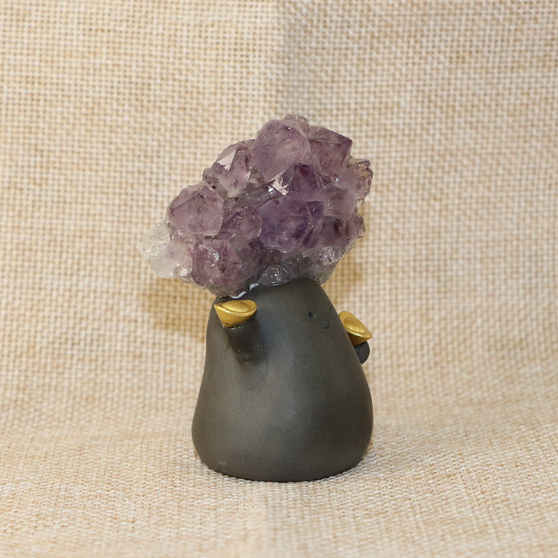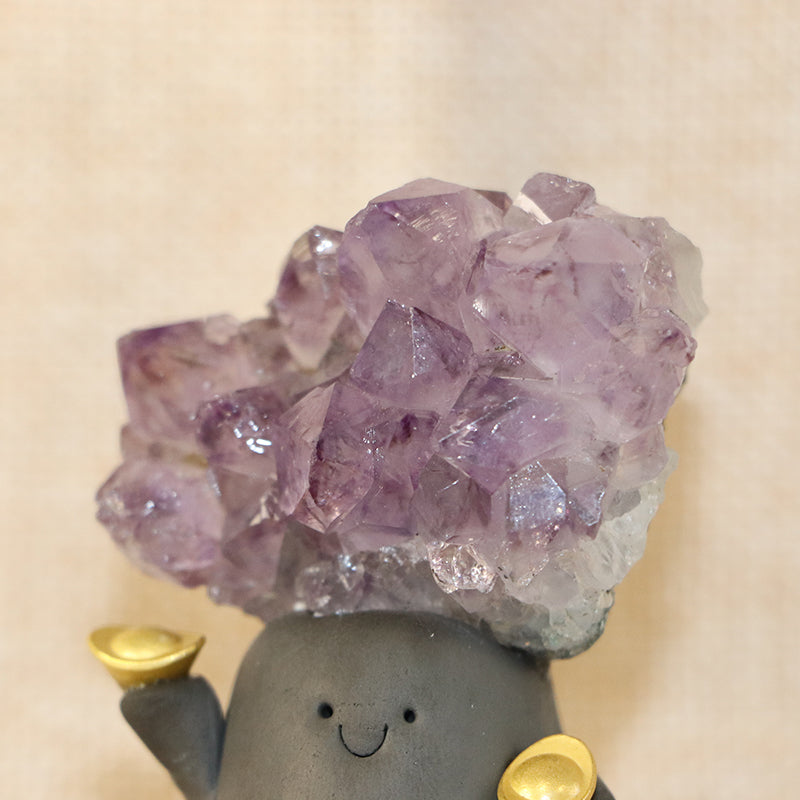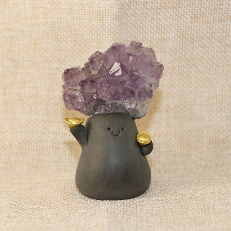 This delightful crystal pet features a handcrafted clay figure holding golden ingots in both hands, with a radiant Uruguayan amethyst cluster blooming from its head. The deep violet crystals sparkle with natural brilliance, known for their high quality and strong spiritual energy.