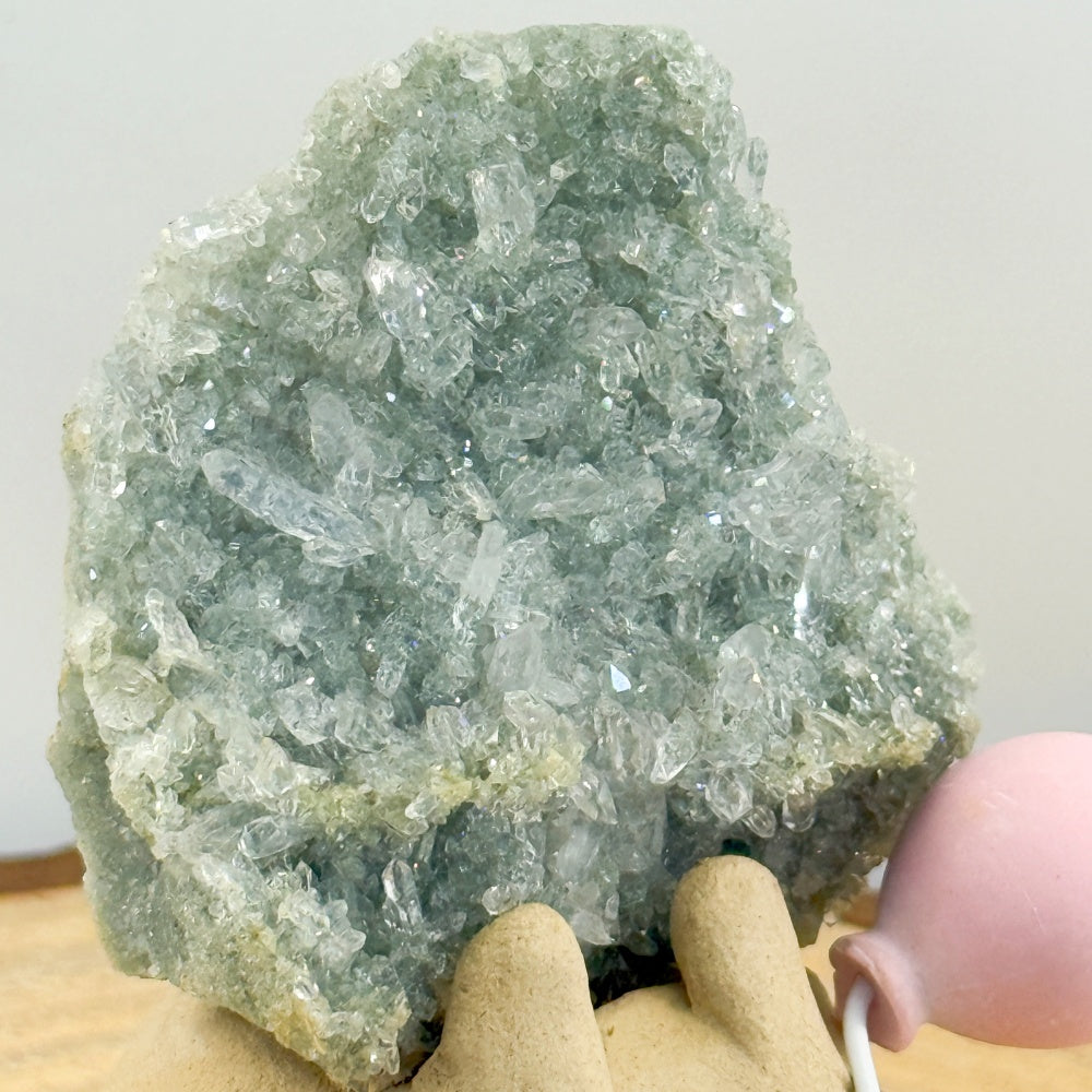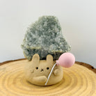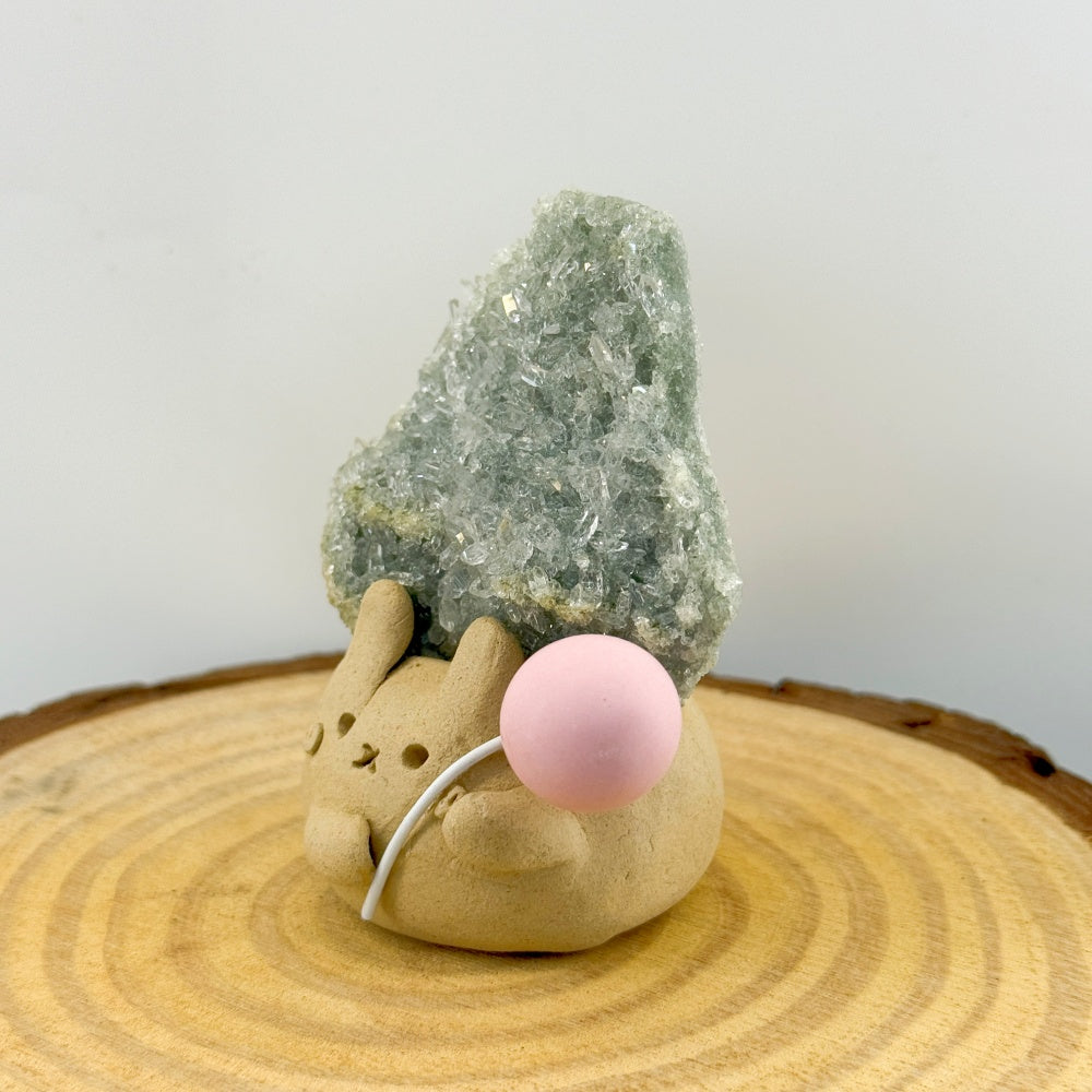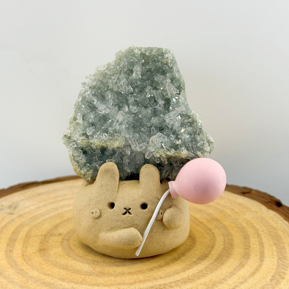 This Green Phantom Crystal Pet is entirely handcrafted from clay by the designer. Shaped into a soft, round little bunny, it carries a gentle, comforting charm, while the pink balloon in its hand adds a touch of innocence and lighthearted joy. At the top sits a natural Green Phantom quartz cluster, its soft forest-green glow clear and delicate—like holding a quiet piece of nature gently above its head.