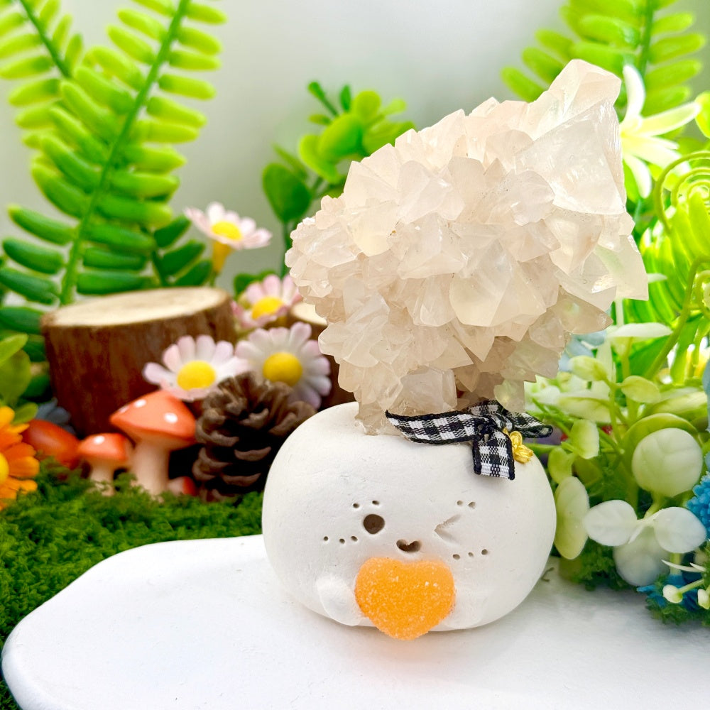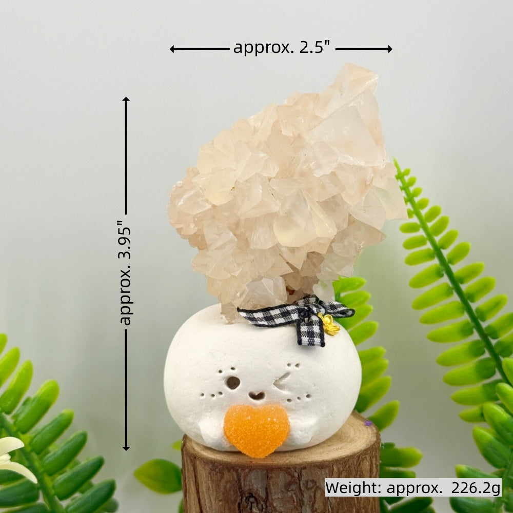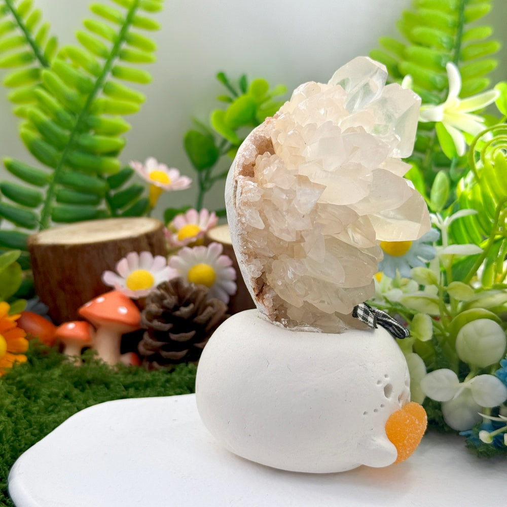 The natural white calcite blooming on its head symbolizes purification, clarity, and calm strength, helping soothe emotions and lift your mood so you can rediscover lightness and peace in the midst of a busy day.