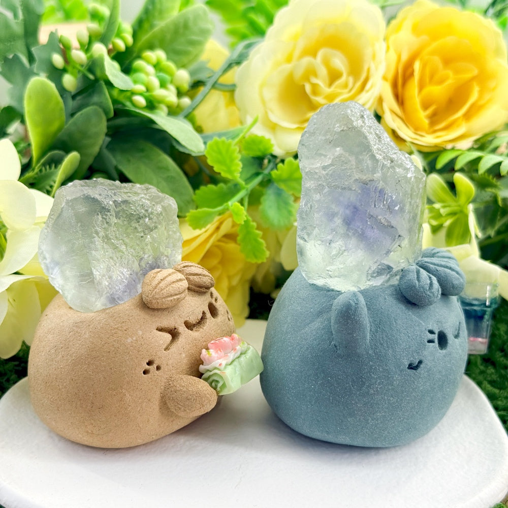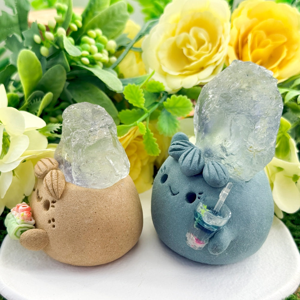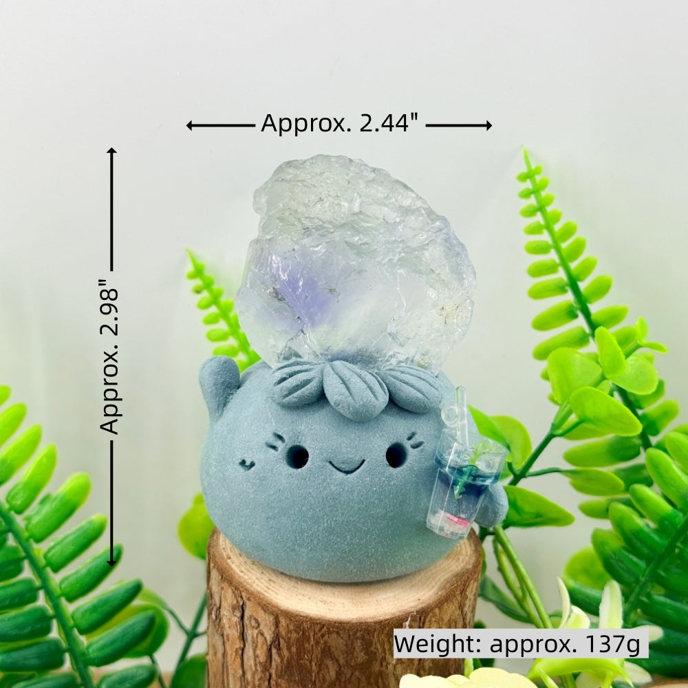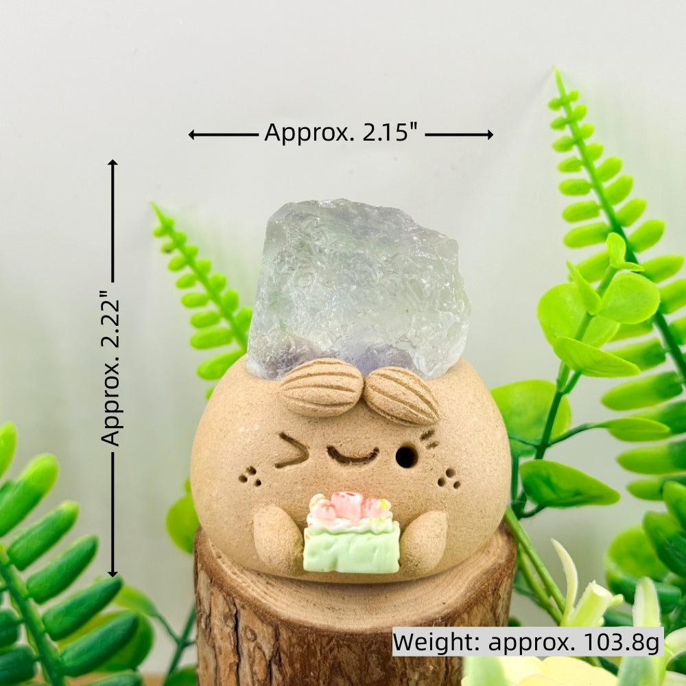 This Amethyst Ball Crystal Pet is handcrafted from clay with a cute and rounded design. On its head sits a polished, translucent natural amethyst sphere, adorned with a delicate butterfly charm—like a quiet little healing spirit by your side.